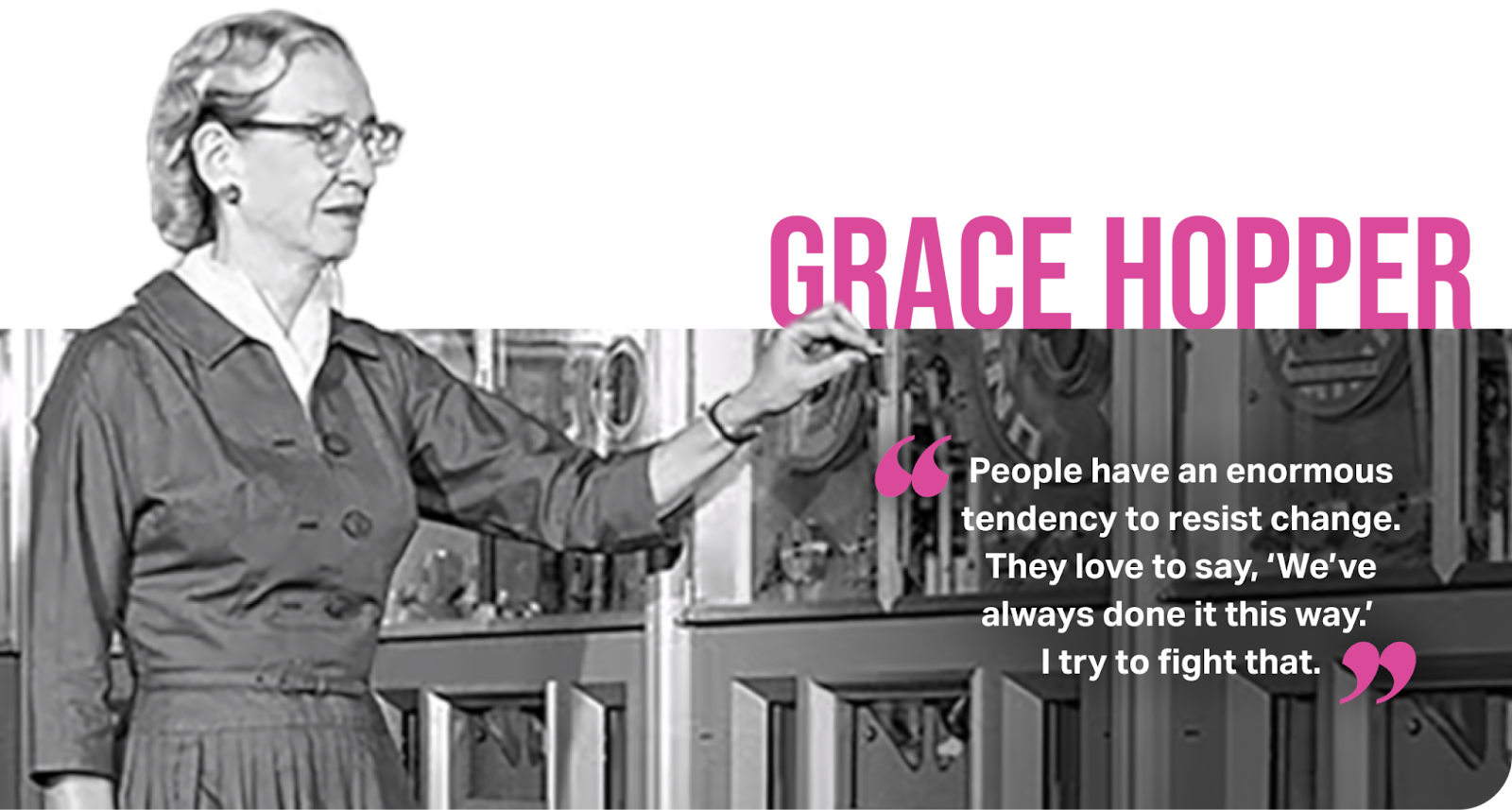 Grace Hopper’s life was one of constantly pushing boundaries, creating change and refusing to let the status quo stay status. Or quo. In 1934 she received a PhD in math, one of only a handful of women to earn such a degree at that point in history; and during a period between 1862 and 1934 where only 1,300 women or men received a PhD in math. Hopper was also key in developing COBOL, the first high-level